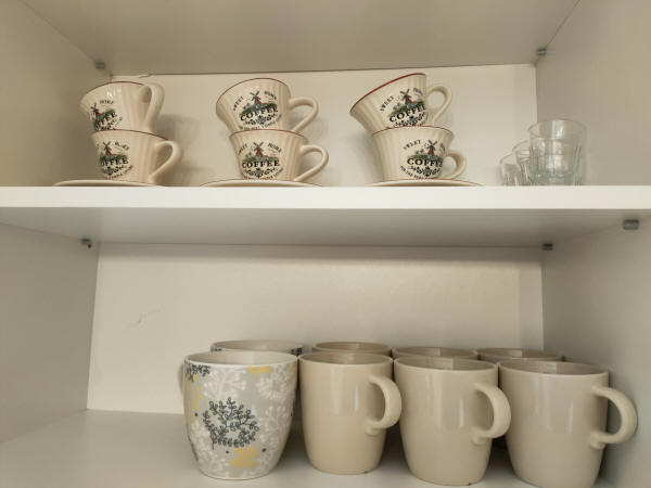 con horno, cafetera, lavavajillas, microondas, hervidor eléctrico, vajilla: tazas,